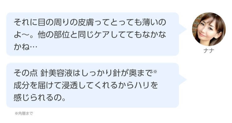 針美容液って痛いのかとドキドキしたけど、ほんのすこしピリッとするくらい。塗った直後から目元や口元がイイ感じ!翌朝のコンディションも気に入ってます!