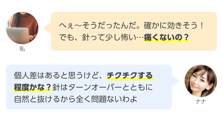 初めてニードル美容液を使った時はチクチクして、大丈夫かなと心配でしたが、3日後位からはチクチクも なくなり、悩みが気にならなくなりました。先日、久しぶりに会った友人から顔にハリがあって艶々してるね!と言われました。続けて1週間、肌のコンディションが良い気がして満足です。