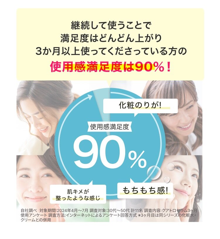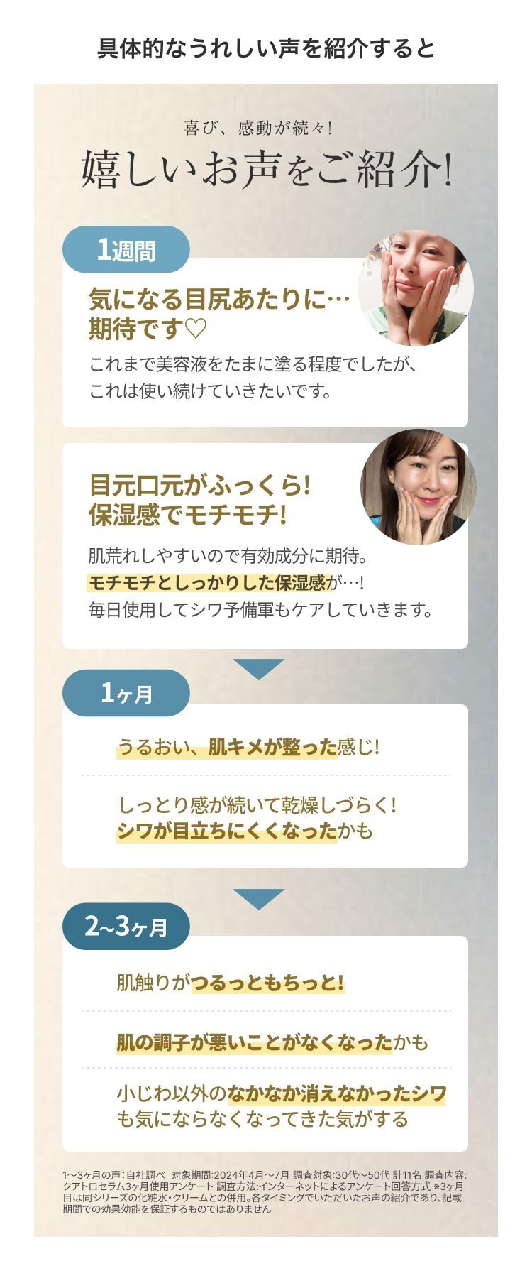 シワが気になり、保湿重視でケアをしてきました。1週間使ってみて保湿力がアップした気がします。シワ予備軍にも効果があるクアトロセラムは、今取り入れるべき美容液 だと思います。シワを作りたくないので、長い目で使っていきたいです。